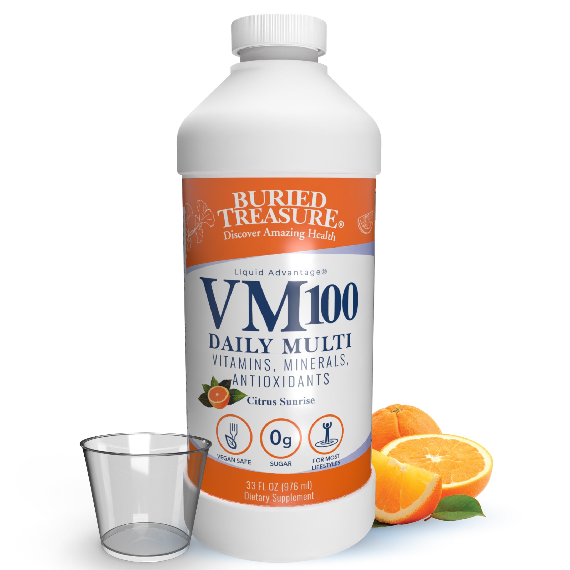 Buried Treasure VM100 Complete Daily Liquid Vitamins and Minerals plus Antioxidants Supplement for Maximum Absorption Great Tasting with Dose Cup